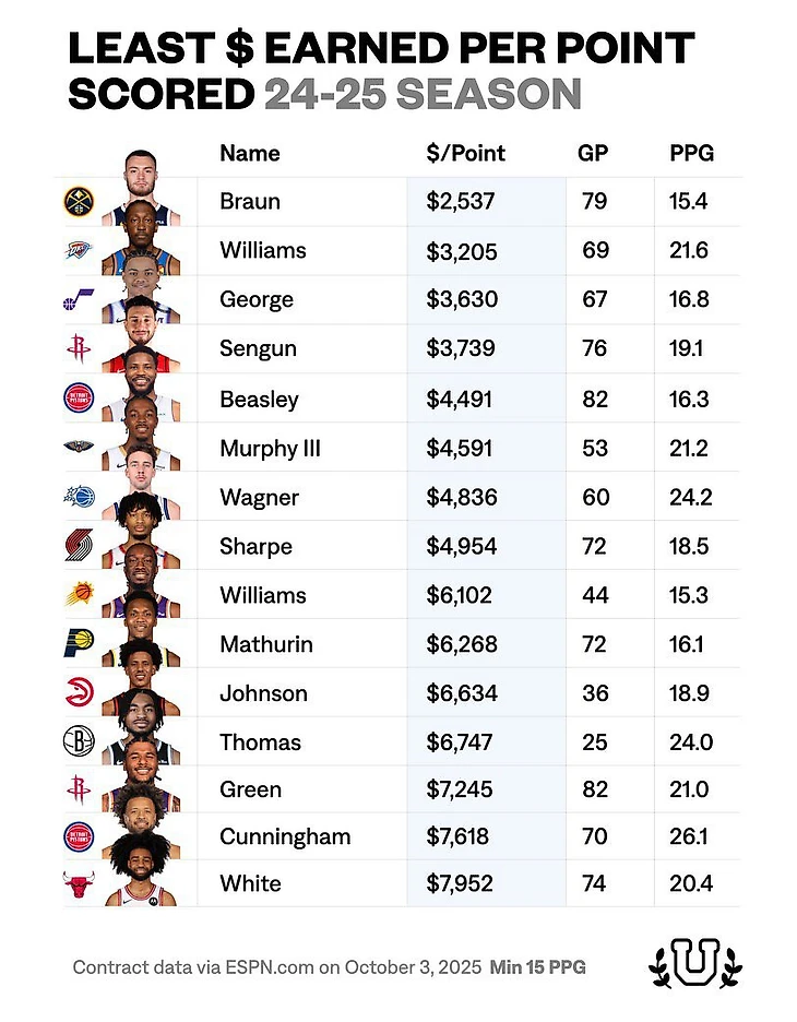 Защитник «Денвера» заработал чуть меньше 3,1 миллиона в прошлом чемпионате и набрал 1218 очков за «регулярку». Набранные им очки стали самыми дешевыми (2537 доллара за 1 очко) в сезоне среди игроков с 15 очками в среднем за матч и более.