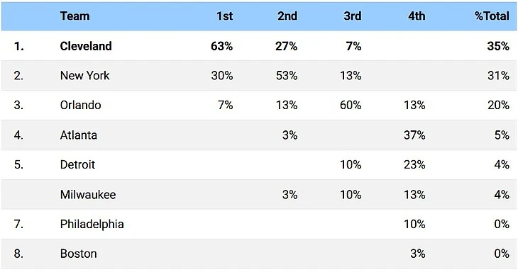 Лидерами, по результатам опроса руководителей клубов, стали победители прошлой «регулярки» – «Оклахома» и «Кливленд». Вторые места достались «Денверу» и «Нью-Йорку».
