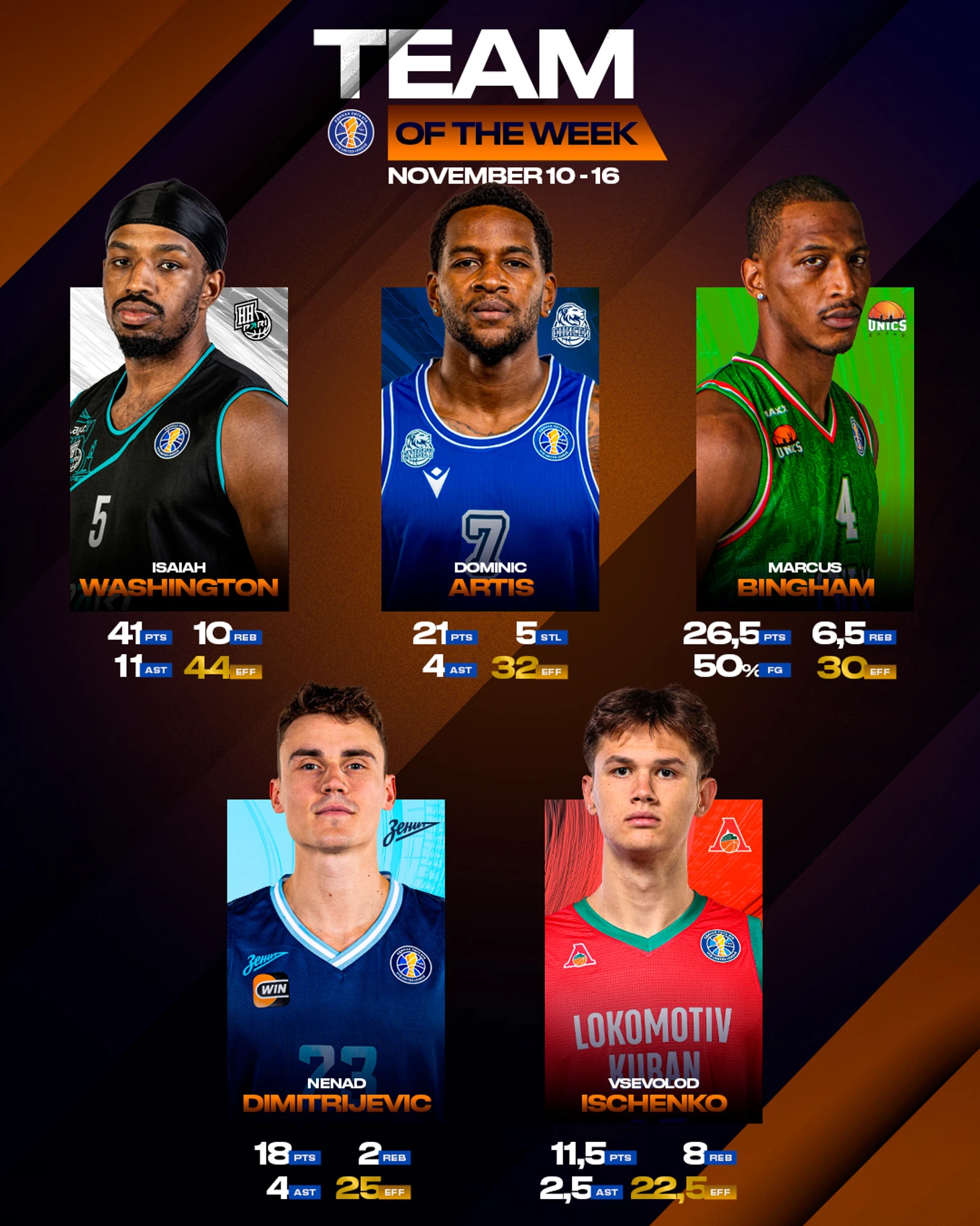 Единая лига ВТБ определила лучших игроков по итогам прошедшей игровой недели. По итогам матчей 10 – 16 ноября в символическую пятерку вошли разыгрывающие Айзейя Вашингтон («Пари НН») и Ненад ДимитриевичЗенит»), атакующие защитники Всеволод Ищенко («Локомотив-Кубань») и Доминик Артис («Енисей»), а также центровой Маркус Бингэм (УНИКС).