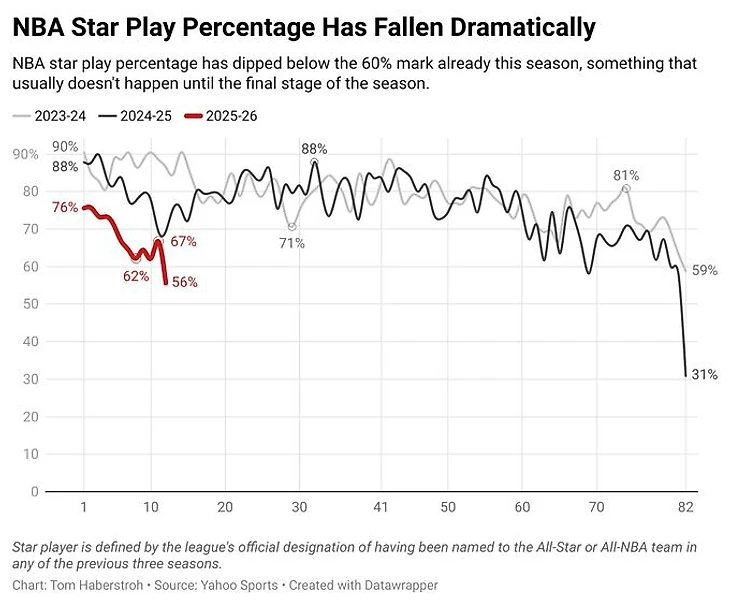 По данным Yahoo Sports, количество пропущенных матчей звездными игроками НБА удвоилось по сравнению с сезоном-2023/24.