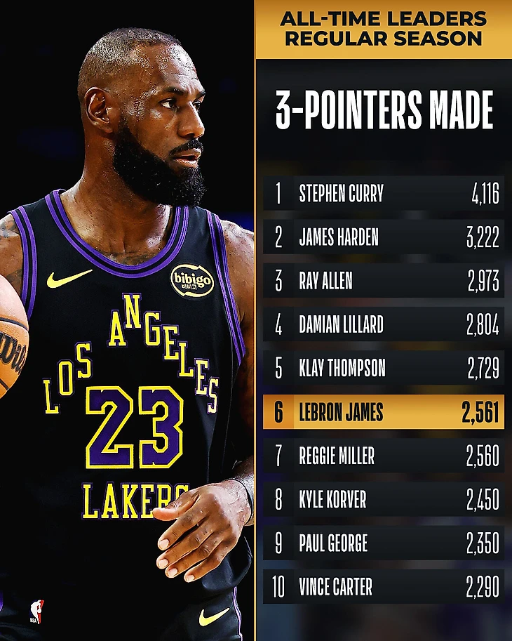 В первом матче своего рекордного 23-го сезона Джеймс обошел Реджи Миллера (2560) по количеству трехочковых (2561).