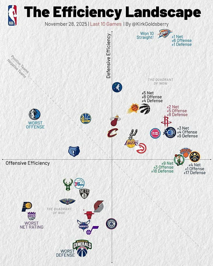 Аналитик Кирк Голдсберри выложил новый график эффективности клубов НБА.