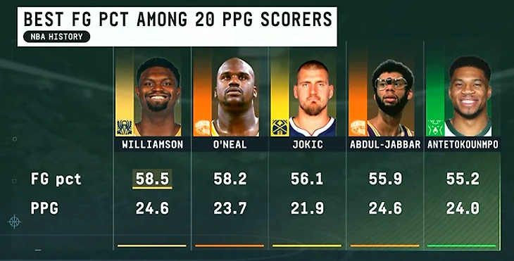 Зайон Уильямсон опережает Шакила О’Нила и Николу Йокича в эффективности.