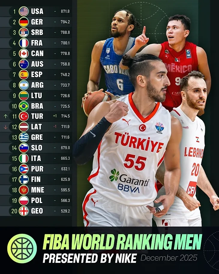 ФИБА обновила рейтинг сборных после завершения континентальных квалификаций. Топ‑10 остался без изменений. Лидируют США, второе место удерживает Германия, тройку замыкает Сербия.
