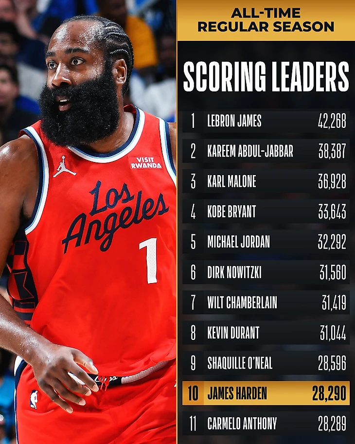 Звезда «Клипперс» Джеймс Харден в субботу вошел в Топ-10 самых результативных игроков НБА всех времен, обогнав Кармело Энтони.