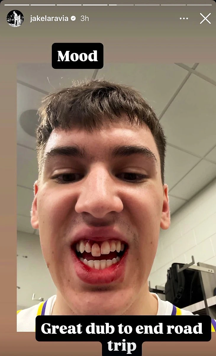 В первой четверти матча против «Филадельфии» форвард «Лейкерс» Джейк Ларэвиа столкнулся с защитником «Сиксерс» Джаредом Маккейном и покинул площадку, держась за лицо.