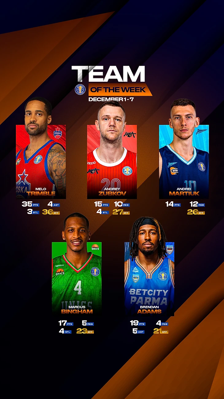 Тримбл, Бингэм, Мартюк, Зубков и Адамс – в символической пятерке недели Единой лиги ВТБ