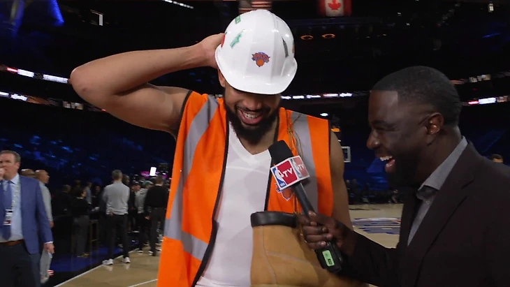 После победы над «Орландо» в полуфинальном матче Кубка НБА центровой «Нью-Йорка» Карл-Энтони Таунс дал интервью, одевшись в светоотражающий жилет, строительную каску и с ботинками на шее.