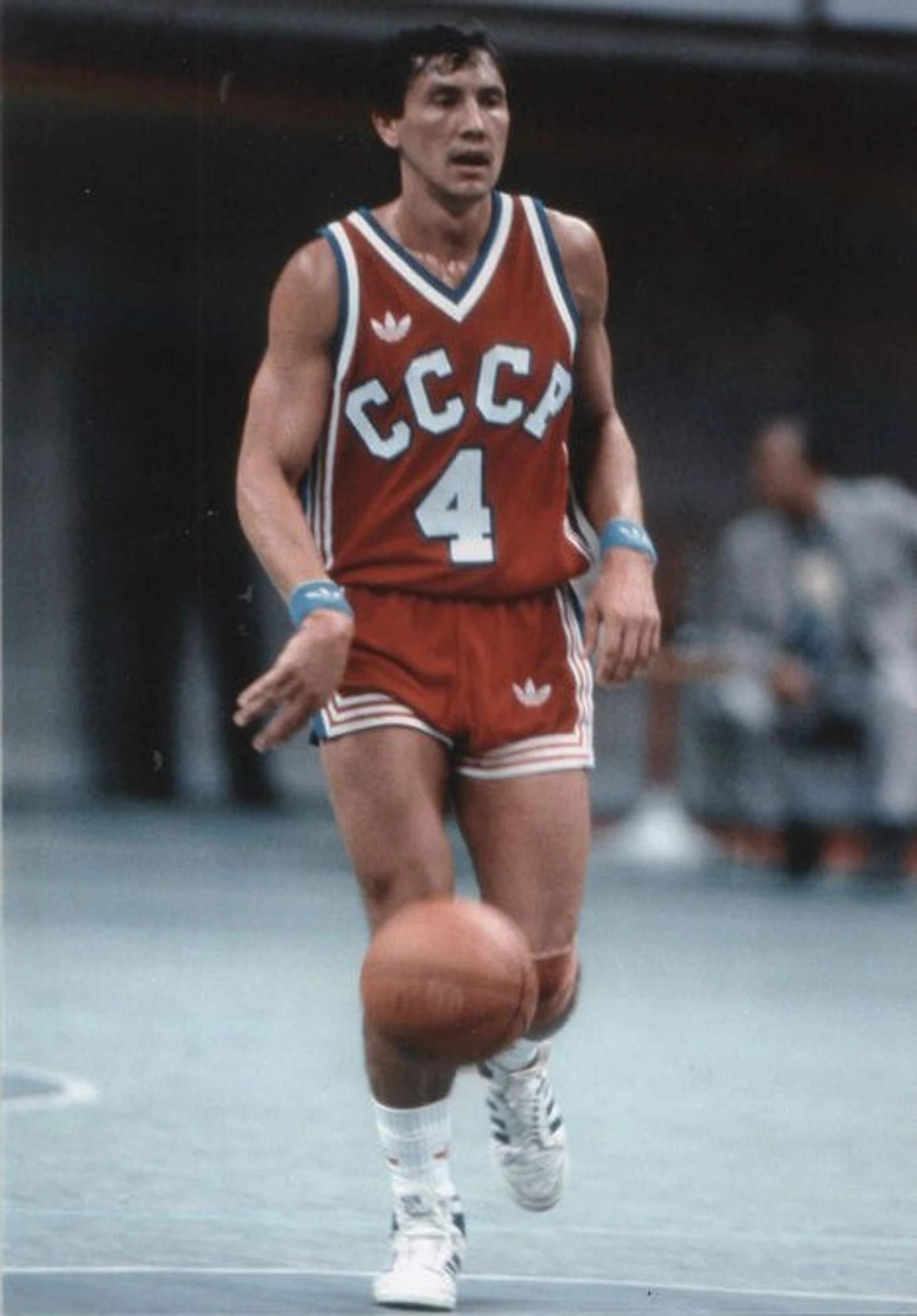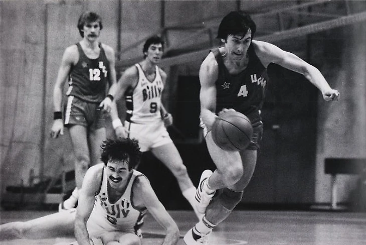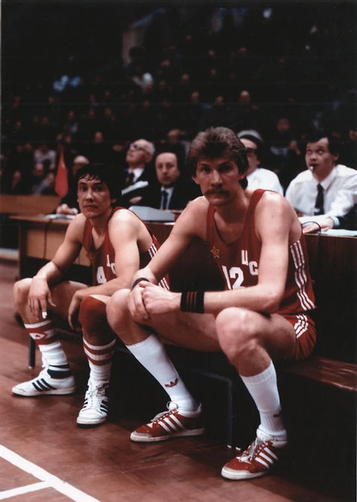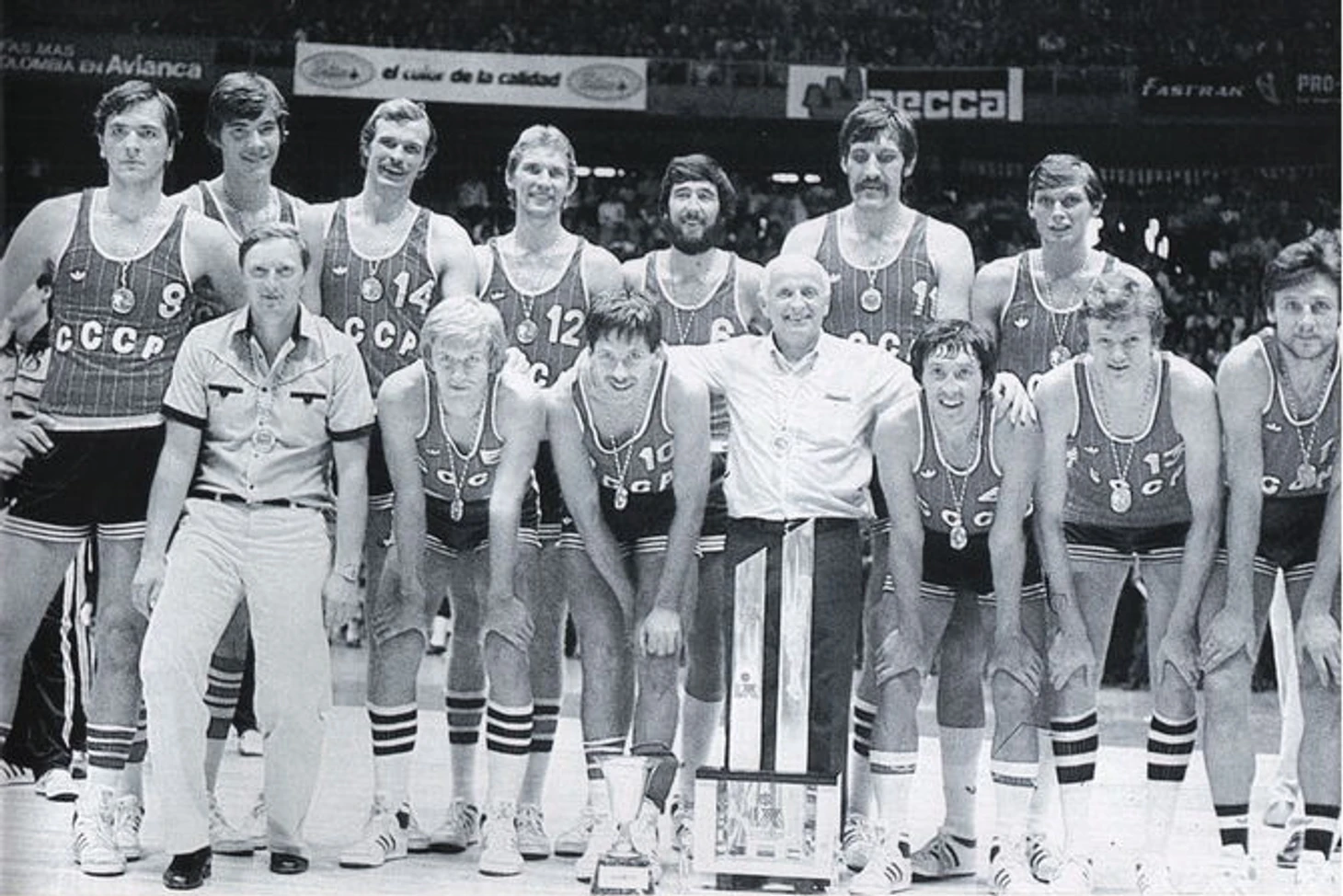 Замечательный снимок после победы на Чемпионате мира 1982 года в Колумбии. В центре – счастливый Гомельский. «Папа» всегда умел вселить веру в то, что мы лучшие. Великолепная команда была с очень талантливыми «большими» – здесь и Сабонис (222 см) и Ткаченко (222 см), и Белостенный (214 см), и Дерюгин (206 см) и Лопатов (206 см) – все, как на подбор. Через год добавится еще и Марчюленис. Считаю, что это сборная была ничуть не слабее легендарной команды 88 года, которая выиграла Олимпиаду в Сеуле.