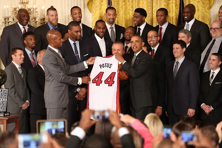 Во вторник, 14 января, Барак Обама принимал в Белом доме чемпионов НБА сезона-2012/13 «Майами». Во время встречи игроки «Хит» подарили президенту США именную игровую майку с 44-м номером и надписью «POTUS» (President Of The US), а также мяч с автографами всей команды.