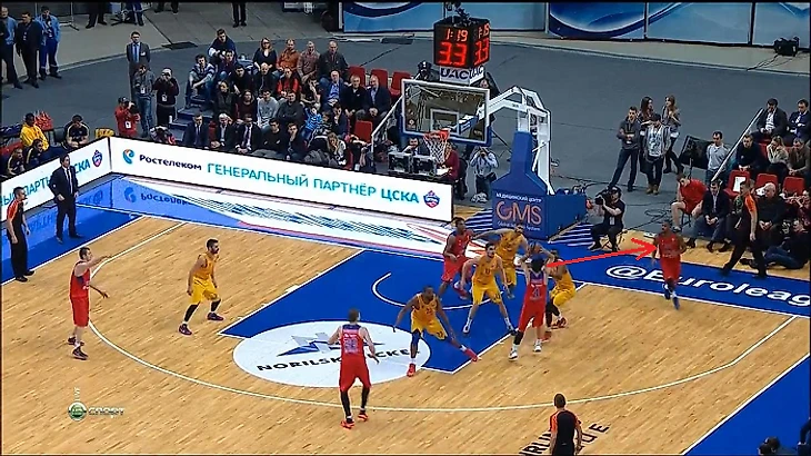 Подавляющее большинство разыгрывающих в такой ситуации отдали бы мяч под кольцо. Но Теодосич не был бы сам собой, если бы не имел в запасе альтернативное решение. Неудивительно ,что вместо Воронцевича передача ушла на периметр Курбанову.
