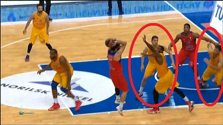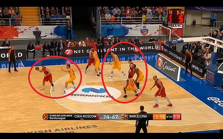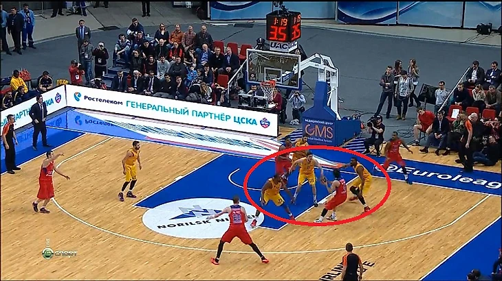 Эффект неожиданности работает на руку Теодосичу даже в тех ситуациях, когда оборона соперника делает все правильно. К примеру, в этом эпизоде против Милоша на периметре защищался высокий Везенков, а трехсекундную зону страховали сразу два «больших» игрока испанского клуба.