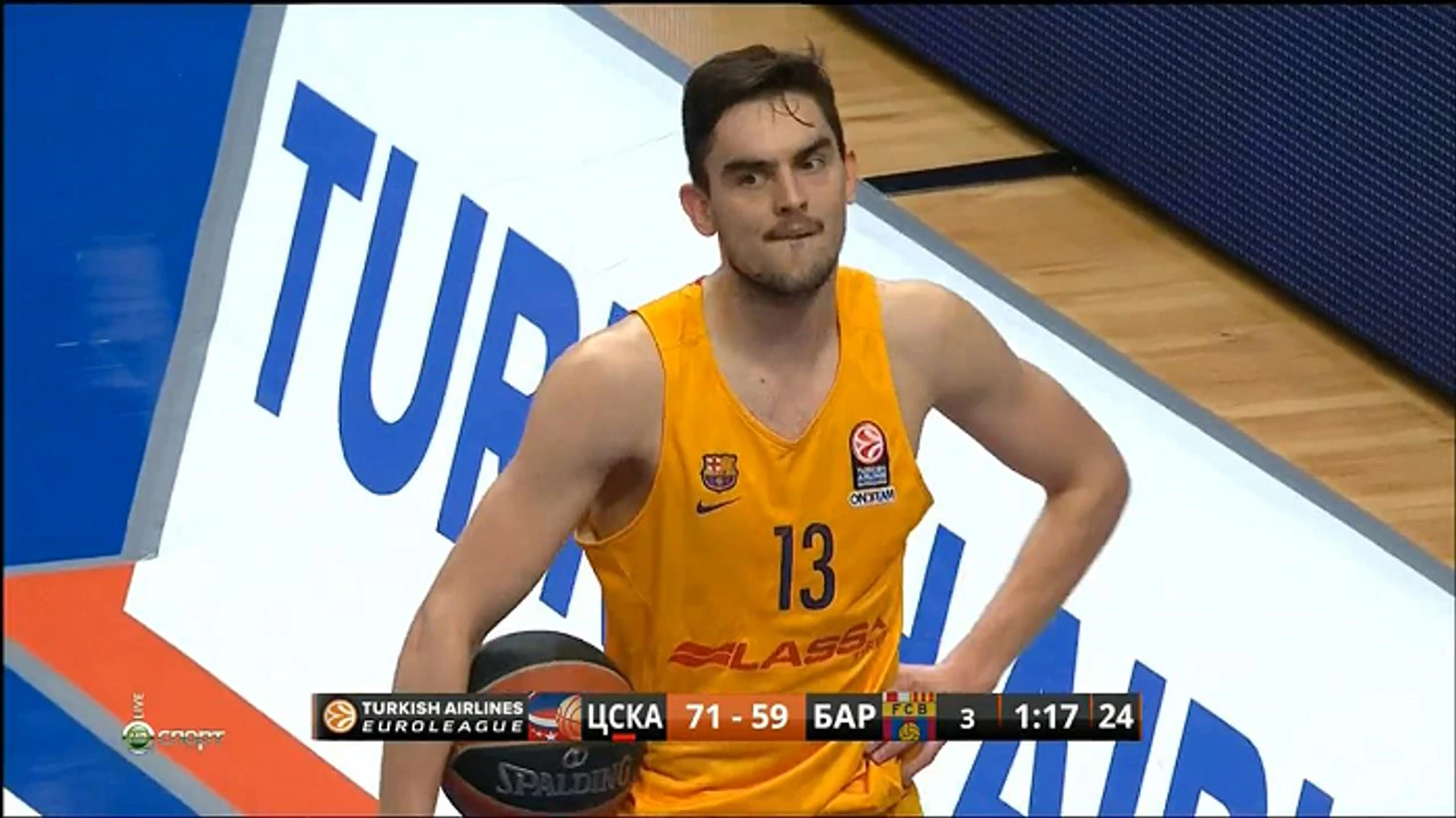 Но это не остановило сербского защитника ЦСКА. Отвернувшись от кольца, он отдал неожиданную передачу в «краску». И, пока игроки «Барселоны» осознавали происшедшее, Семен Антонов успел занять выгодную для атаки позицию.