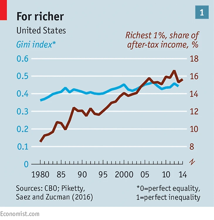 Американский средний класс вообще показал темпы роста доходов хуже чем у кого -либо в OECD и теперь уже канадский средний класс считается самым успешным, а не американский. Зато американские элиты взлетели до небес. Как результат за последние 30 лет общий доход топ 1% американцев вырос с 10 до 20% от общего и вернулся на уровень столетней давности, а gini вырос с 0.30 до 0.40 (0 – полное равенство всех, 1 – когда все принадлежит одному человеку, а у других ничего нет).