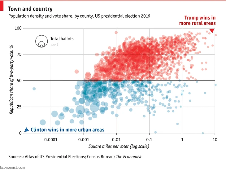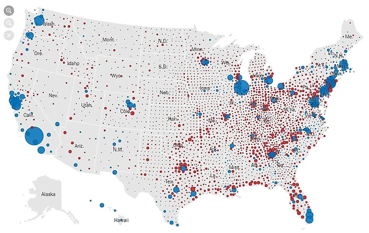 С этой точки зрения очень интересно посмотреть на карту голосования в США. Оычно на карте отражают только штаты – либо красным либо голубым – и видно что побережья проголосовали все за Хиллари – а все что между океанами – за Трампа. Однако если посмотреть внимательнее – на карту в разрезе графст – то можно увидеть совсем другую картину – огромную огромную красную карту с маленкими и яркими синими точками.