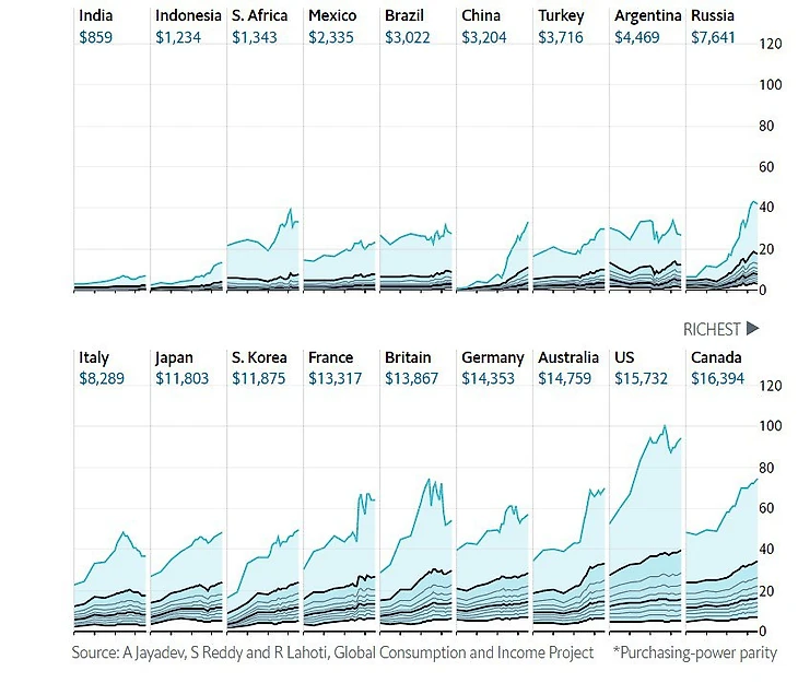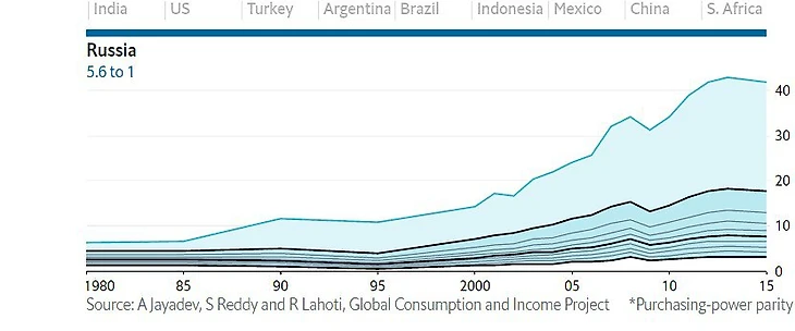 И это характерно не только для штатов – аналогичная ситуация была везде в мире - и в Англии, и в Китае, и в других развивающихся странах - везде индекс неравности доходов стабильно рос эти десятилетия (хотя индекс разрыва доходов между странами немного сократился, но он все равно намного выше чем в 19-м веке, когда самая богатая страна - Англия - была примерно в 5 раз богаче средней бедной страны, а сейчас аналогичный показатель для США это примерно 25).