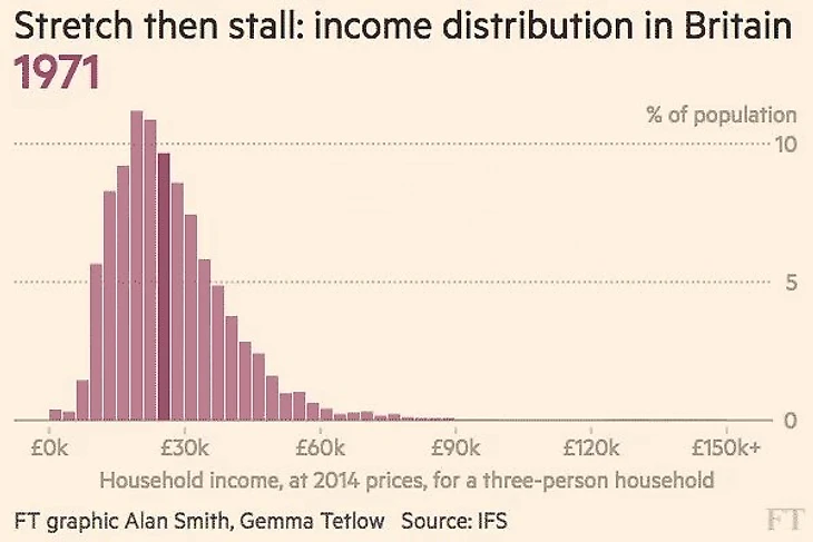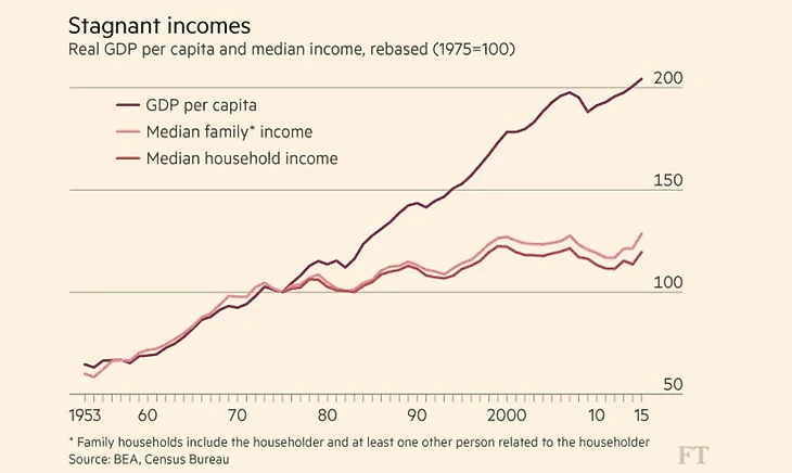 Возьмем например США как самый очевидный пример. Средние реальные доходы населения за период с 1975 по 2015 год выросли достаточно прилично (на 77% в реальном выражении по некоторым расчетам) – однако у 1% населения они выросли в 3-4 раза (топ-менеджеры, хай стрит финансисты, ведущие ИТ-шники, плюс предприниматели, разные звезды шоу бизнеса, ТВ и спорта (у среднего игрока НБА доход вырос примерно раз в 20)). У топ 5% они выросли примерно в 2 раза – это разные программисты, прочие финансисты, юристы, дизайнеры, инженеры, консультанты, управленцы, другие люди современных профессий. При этом, у нижних 90% они выросли в среднем только на 30%, а если посмотреть только на нижние 50% - то у них они не выросли вообще.