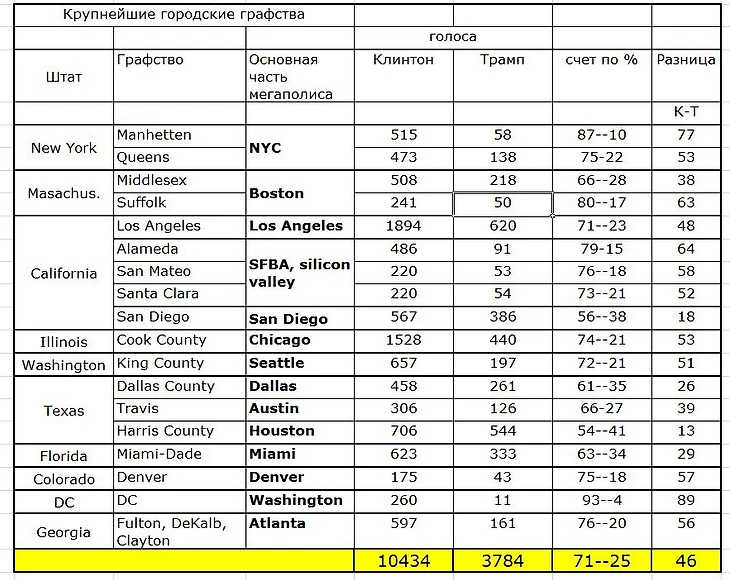 Все просто – за Хиллари в одну калитку с огромным перевесом проголосовали все крупные города США. В НЙ на Манхеттене например с гигантским счетом 87 на 10 %, в Лос Анжелесе - самом крупном графстве страны с населением в 10 млн человек 71-23 (2 млн на 600 тысяч - еще миллиона 3 не пришли - но это ни на что не повлияло бы), в СФ, Чикаго и Атланте - самых крупных после НЙ и ЛА мегаполисах еще больше - порядка 75%. Вот решил примерно обобщить: