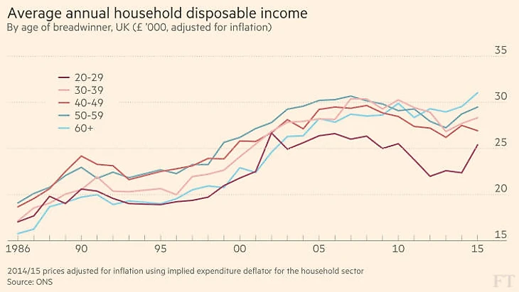 Кроме того их доходы начали отставать от других поколений - хотя раньше такого не было - в период кризиса именно поколение миллениалов пострадало больше всего. А вот пенсионеры как ни странно выиграли и стали сейчас самой состоятельной прослойкой. Еще 30 лет назад 25-30 летние зарабатывали куда лучше 55-60 летних - а сейчас уже заметно хуже. И так вероятно будет на всем протяжении их жизни - они будут уступать тем, кто снял все сливки с общества благоденствия и прошлых эпох бурного роста - и продолжает снимать и сейчас (бэбибумеры и тд).