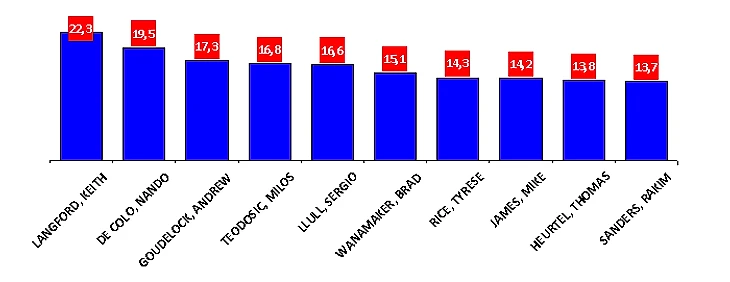 Взгляните на список лучших снайперов Евролиги прямо сейчас. И вы увидите там сплошь защитников. Лэнгфорд, Де Коло, Гаудлок, Теодосич, Юль оккупировали верхние строчки. И лишь форвард «Милана» Раким Сандерс замыкает десятку самых результативных игроков.