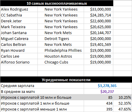 Не спрашивайте, кто эти люди с именами мексиканских наркобаронов или героев мыльных сериалов. Смотрите на цифры – в бейсболе самые максимальные контракты и лишь немногим меньше, чем в NBA, «мультимиллионеров». Но при этом игроков с зарплатами больше миллиона меньше, чем даже в NHL.