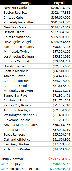 Блеск и нищета капитализма! Богачи-владельцы Yankees выплачивают своим игрокам 7.5% общего зарплатного фонда MLB, а Pirates довольствуются в шесть раз меньшей суммой. Эти же клубы являются самым щедрым и самым прижимистым соответственно во всех лигах. Средняя зарплата в бейсболе на втором месте после баскетбола.