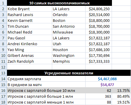 Усредненные цифры показывают, что при стандартном ростере в 15 игроков большинство команд платит 12 игрокам основного состава больше 1 миллиона в год (причем 2-3 баскетболиста получают больше 10 миллионов), а 3 резервистам – меньше миллиона. Четверо из пяти игроков NBA – «миллионеры».