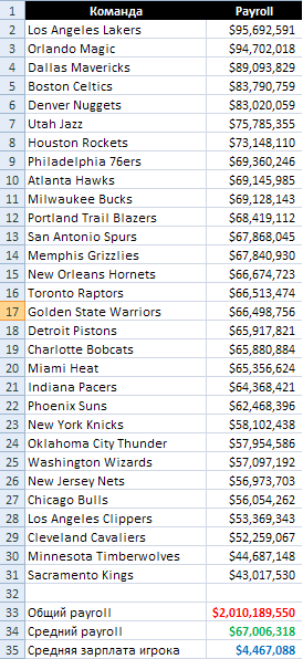 Как видим, общий фонд заработной платы в NBA – больше 2 миллиардов долларов, а средняя зарплата игрока – примерно 4.5 миллиона в год, что немного отличается от цифр, приводимых мной раньше.