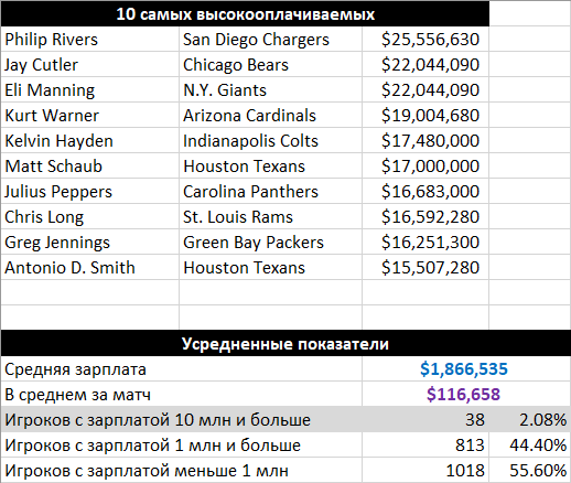 К сожалению, мне не удалось найти полную информацию по платежкам в текущем сезоне. Но для общей картины нам хватит данных и по сезону 2009. Некоторые многомилионные контракты, подписанные в 2010 (например, новый контракт Пэйтона Мэннинга на 30.8 миллионов), серьезно статистику не изменят. Где-то прибыло, где-то убыло.