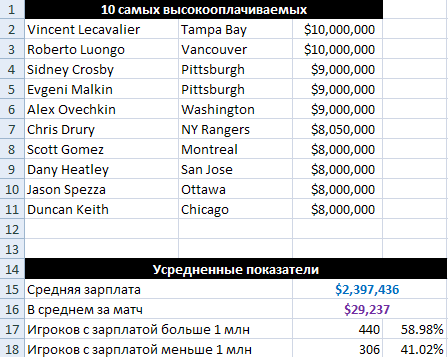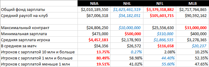 Вооружимся гуглем и самостоятельно посчитаем статистику зарплат игроков в четырех крупнейших спортивных лигах США. Возможно, источники, из которых я брал информацию раньше, неточны, и хоккеистам, как и баскетболистам приходится подрабатывать на выходных в МакДональдсе.