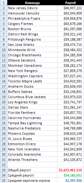 NHL (по данным http://www.nflscap.com и http://www.capgeek.com/ ) за сезон 2010-2011