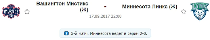 У Вашингтона опять Делле Доне набрала 25 очей как и Толивер, а Миссеман на этот раз прикрыли. Я не буду делать глупость и верить в Вашингтон, потому что в первой игре их драли в 30 очей, во второй игре если не считать чудного старта они проиграли в 20 очей, как видим они просто не тянут уровень “Линкс” четверть - две потянут, но вот целый матч? Я очень сомневаюсь, даже глядя на невыразительную игру Линкс на выезде в последних матчах, поэтому жду что хозяева опять окажутся у разбитого корыта. Ставки пишу сегодня потому что завтра вероятно не успею, хочу нормально поспать) да и буду занят превью НФЛ.