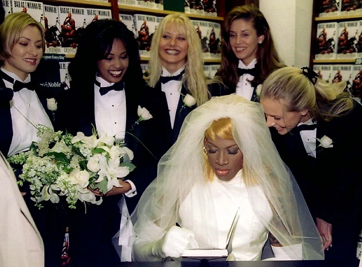 8. Представил свою первую книгу в свадебном платье и вроде как даже женился сам на себе, а вторую книгу Деннис Родман представил в гробу.