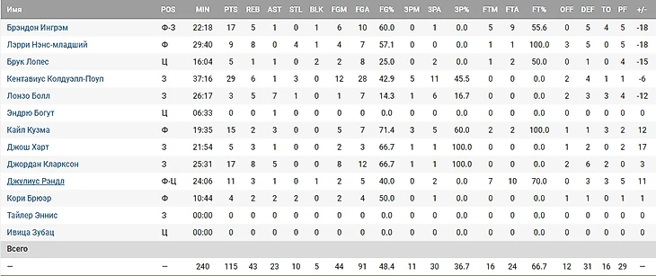 При этом всём Кузма, Лопес и Кларксон провели в последней четверти 12 минут из 36.