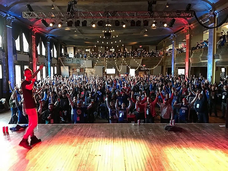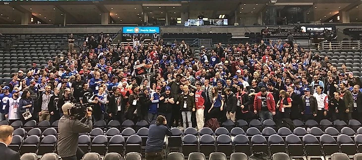 Что же касается организованной поддержки со стороны фанатов, то новая волна зародилась еще в сезоне-2013/14, в самом начале «Процесса». Год назад в своей заметке о поездке в США на матч Филадельфии я уже писал об этом движении и лицах, которые за ним стоят. Основным идейным вдохновителем является Спайк Эскин, программный директор одного местного радио и ведущий подкаста «Rights To Ricky Sanchez» (RTRS). На тот момент в активе RTRS уже была ставшая ежегодной вечеринка, посвященная лотерее Драфта «RTRS Lottery Party» с количеством участников более 2000 человек, знаменитый билборд, посвященный Сэму Хинки, и выезд в Вашингтон группой в 350 человек. Поездка 450 фанатов Филадельфии на матч регулярного чемпионата в Милуоки стала новой ступенью в развитии культуры поддержки команды.
