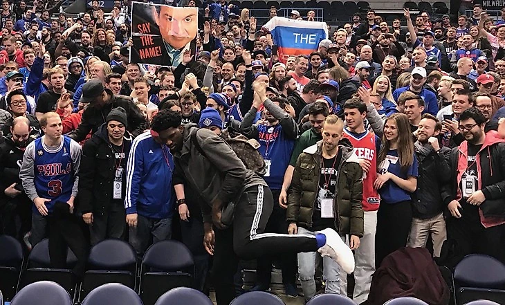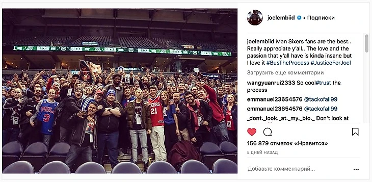 Чуть позже Филадельфия довела преимущество до 10:0, вынудив соперника взять таймаут, во время которого Эмбиид передал привет нашему сектору: