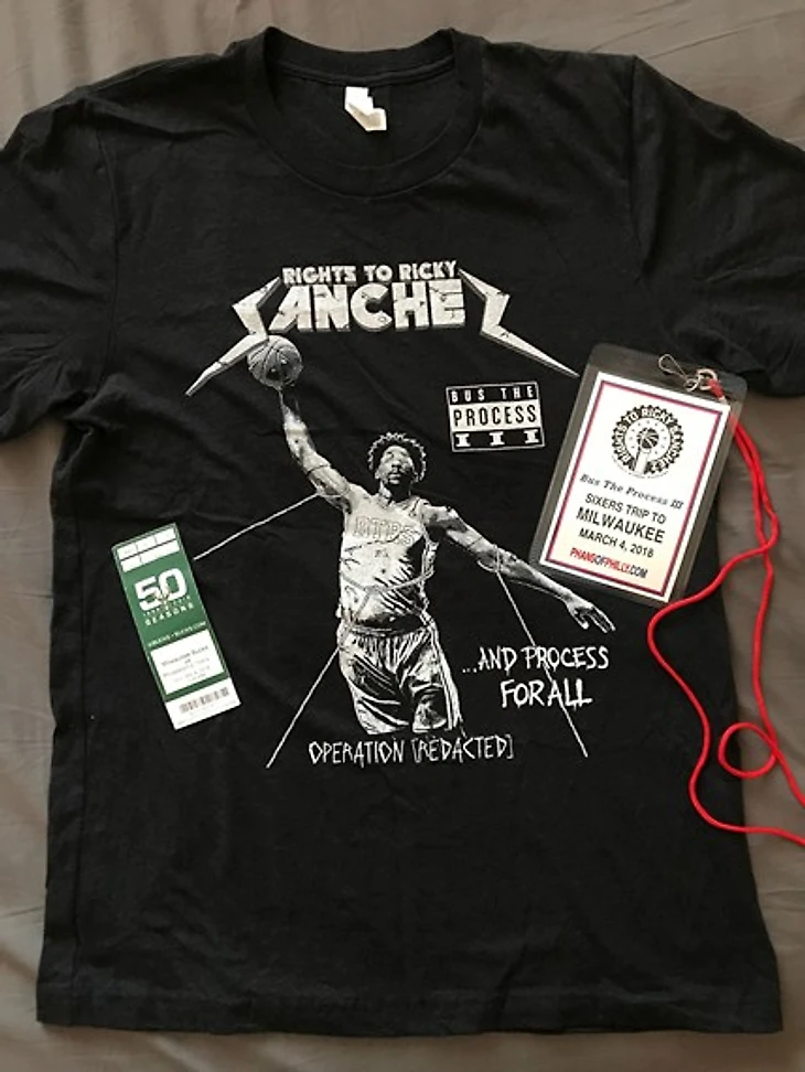 Этого было достаточно, чтобы создать концепцию поездки. Как и все, что делает эта группировка фанатов (это можно понять уже по названию подкаста), третий по счету «Bus The Process» получил слегка вызывающую, но при этом нарочито нелепо-забавную тематику. Официальным названием выезда стало «Operation «Shithole», официальным хэштэгом – #JusticeForJoel (“Справедливость для Джоэла”), а на футболках изобразили Эмбиида с завязанными глазами и веревками, с помощью которых некто пытается повалить его на землю (особо искушенные поклонники рока наверняка смогут углядеть здесь отсылки к альбому группы Metallica «… And Juctice For All» 1988 года). Правда чуть позже в США разразился очередной скандал вокруг Дональда Трампа, который словом «Shithole» назвал некоторые африканский страны. В связи с нежеланием того, чтобы люди видели здесь отсылки к скандальному президенту (причем не из-за какой-либо корректности, а скорее из-за обиды, что Трамп «присвоил» себе ассоциации с этим словом), операцию было решено переименовать. Нового названия так и не придумали и решили оставить его в виде «Operation [redacted]» («Операция [отредактировано]”), что возможно еще более укладывалось в концепцию акцентированной нелепости. Именно в таком виде название и красуется на футболке.