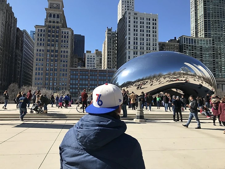 Следующий день был свободным от мероприятий, связанных с поддержкой команды, и поэтому был посвящен исследованию Чикаго. Погода не подвела: 5-6 градусов тепла, ясно и слегка ветрено – пожалуй, идеальная погода для Города Ветров в это время года. Чикаго показался довольно интересным городом, не такой шумный и густонаселенный, как Нью-Йорк, но в то же время ритм большого города ощущается довольно отчетливо. В чем-то похож на Филадельфию по уровню урбанизации и количеству объектов культуры, но визуальный образ совсем иной. Город находится на берегу озера Мичиган и как бы разделен на несколько частей рекой Чикаго, впадающей в озеро. Благодаря этому прямо в центре города можно прогуляться по набережной, перебираясь с одной стороны реки на другой по одному из многочисленных мостов. Одной из основных достопримечательностей, знакомых по многим фильмам, является пролегающий вдоль береговой линии Миллениум парк, а точнее расположенная там знаменитая «фасоль» – сооружение с зеркальной поверхностью, которое на самом деле не имеет ничего общего с растением семейства бобовых. Официальное название этой штуки «Cloud Gate» («Небесные ворота»). Она не несет никакой полезной функциональной нагрузки и, по сути, существует только для того, чтобы быть визитной карточкой города. В городе есть также немалое количество различного рода музеев и других культурных объектов, посетить которые впрочем не удалось из-за нехватки времени.