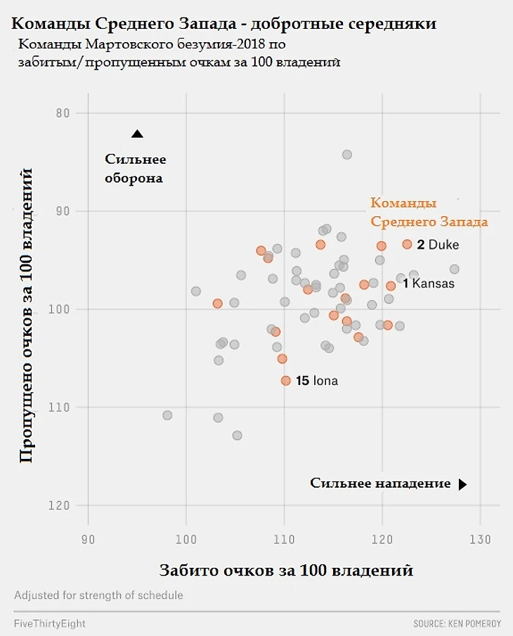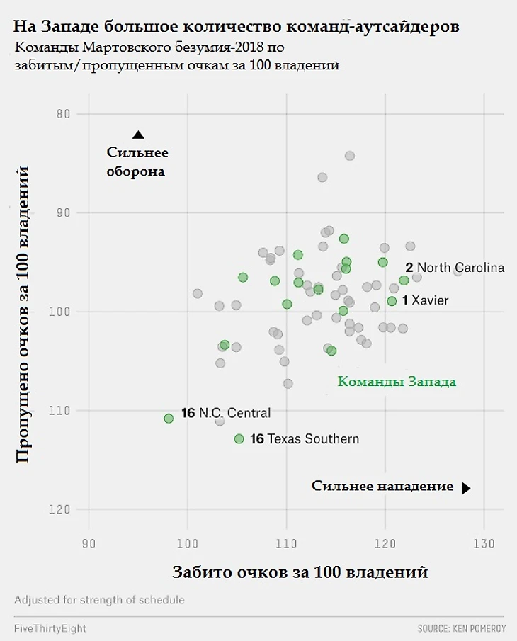 Фавориты: Запад в этом году, вероятно, слабейший регион. Посеянные №1, Ксавьер, по рейтингу FiveThirtyEight идут только 10-ми в стране – что обычно соответствует посеву №3. «Мушкетеры» неплохи в нападении, но по игре в защите идут всего лишь 59-ми (Померой), и именно из-за этого наша модель дает им 18-процентный шанс на попадание в Финал Четырех, худший показатель среди всех первых посевов.