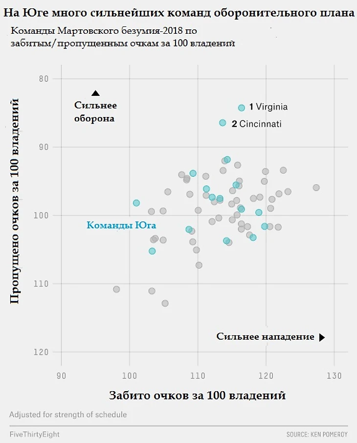 После хаотичного регулярного сезона университетского баскетбола – в течение которого 18 разных команд были на вершине рейтингов топ-5 от AP – наконец, настало время настоящего Безумия! А это значит, что FiveThirtyEight уже мчится к вам со своей прогностической моделью, чтобы помочь составить победную сетку (о работе системы – здесь). Ниже рассказывается о ключевых командах и противостояниях в каждом регионе, включая темных лошадок и золушек, которые могут похоронить самые оптимистичные ожидания от лидеров. На данный момент общепризнанный фаворит – университет Вирджинии – имеет шанс на победу в всего лишь 14%, а это значит, что в этом году Безумие будет еще более безумным!
