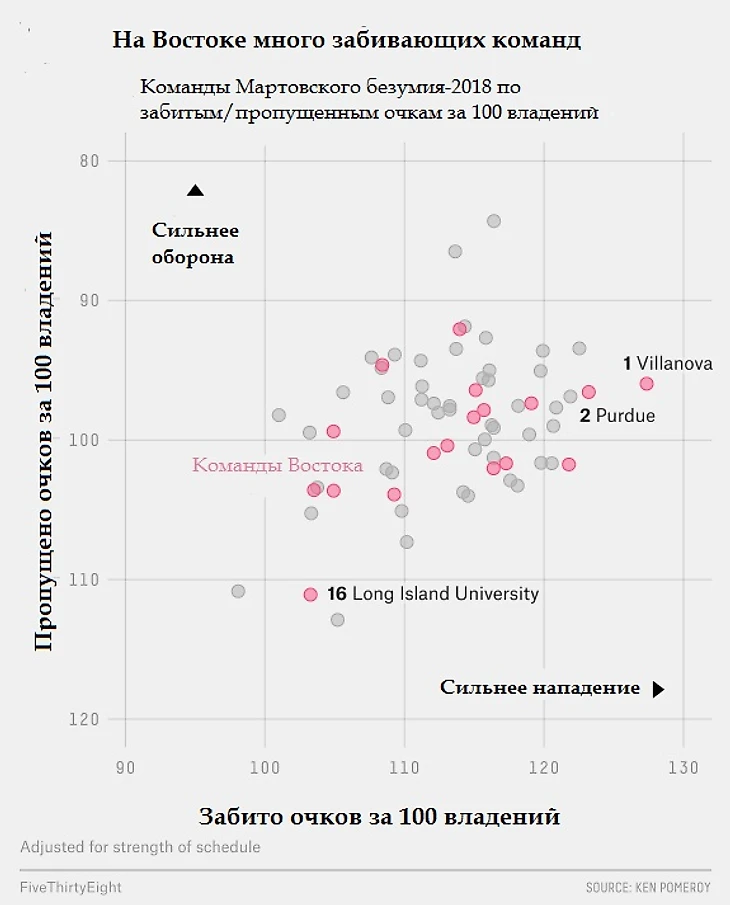 Фавориты: Согласно модели FiveThirtyEight, Вилланова с первого посева имеет лучший в регионе шанс попасть в Финал Четырех, и с 50-процентной вероятностью должны побеждать на Востоке. «Уайлдкетс» – исключительно мощная атакующая команда, которая под руководством защитника Джейлена Брансона заняла первое место по эффективности в рейтинге Кена Помероя в течение сезона. Но с их защитой (22-е место в сезоне) тоже нужно считаться, особенно с универсальным вингером Микалом Бриджесом. Единственная ложка дегтя – посев расположил Восточный регион на одной стороне со Средним Западом, где затаились три команды из топ-8 согласно нашего рейтинга.
