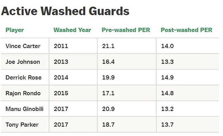 Washed year — год, когда игрок выдохся; Pre-Washed PER — PER перед тем, как игрок выдохся; Post-Washed PER — PER после того, как игрок выдохся.