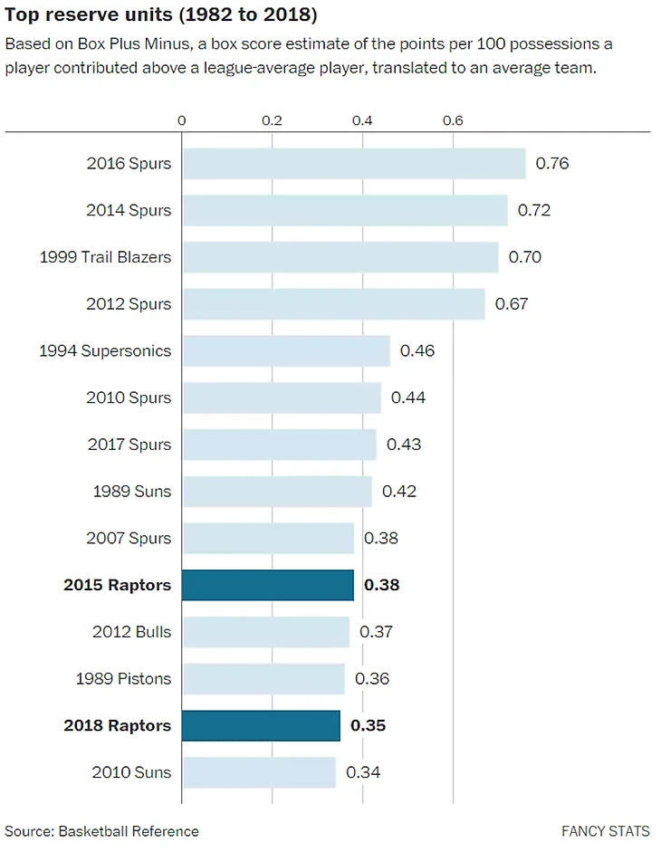 Резервисты «Торонто» – как отдельная команда. И это история не только про набор очков – «Рэпторс» на первом месте в лиге по разнице забитых и пропущенных (+11,3). «Скамейка» канадцев идет с отрывом практически в два очка от ближайших конкурентов.