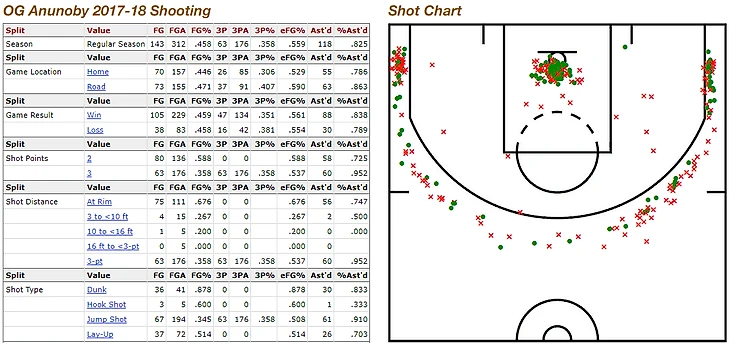 – О Джи Ануноби за весь сезон бросил 10 раз со средней дистанции. ДЕСЯТЬ за 67 матчей. Новичок все еще ищет себя в НБА, но делает это чрезвычайно эффективно. Защита, трехочковые и самые простые броски из-под кольца – он настолько убедителен, что из 67 провел в старте 55 матчей.