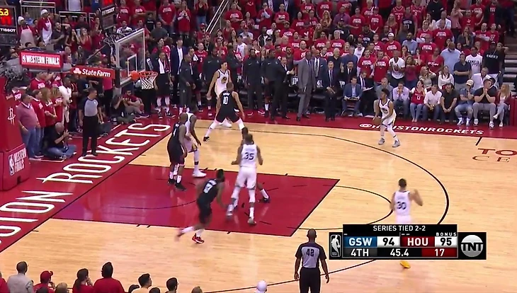 7 секунд на последнюю атаку. «Голден Стэйт» выводит со своей половины, что вроде бы им на руку, так как Дюрэнт может разогнаться с мячом. Карри зачем-то отдает пас, зачем-то на Грина. Тот принимает на ходу, запутывается в руках-ногах и совершает катастрофическую потерю.