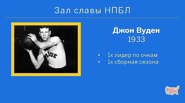 По иронии судьбы Зал славы НБА начинается с великого Джона Вудена, хотя он больше ассоциируется с тренерской работой в университете Калифорнии в Лос-Анджелесе, где он наставлял Карима Абдул-Джаббара, Билла Уолтона и многих других будущих звезд. Но до этого Вуден, тогда еще Джонни Вуден, а не великий Вествудский волшебник, был профессиональным баскетболистом – и по свидительству многих, лучшим защитником первой половины 1930-х.