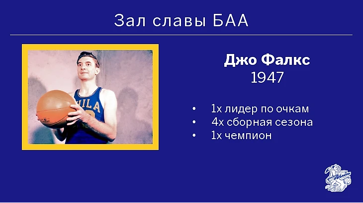 БАА не осталась без звезд. Лига в основном формировалась игроками, вернувшимися с войны. Одним из таких был 26-летний форвард Джо Фалкс, ранее не игравший в профессиональных лигах.