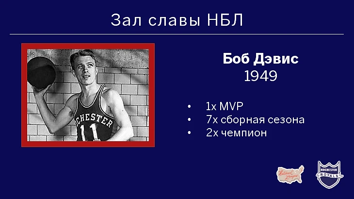 Защитник «Рочестер Ройалз» Боб Дэвис, несмотря на то что уже ушел в БАА, попадает в этом году в Зал славы НБЛ за свои совокупные заслуги в предыдущие три сезона – никто из оставшихся в лиге игроков его не догнал.