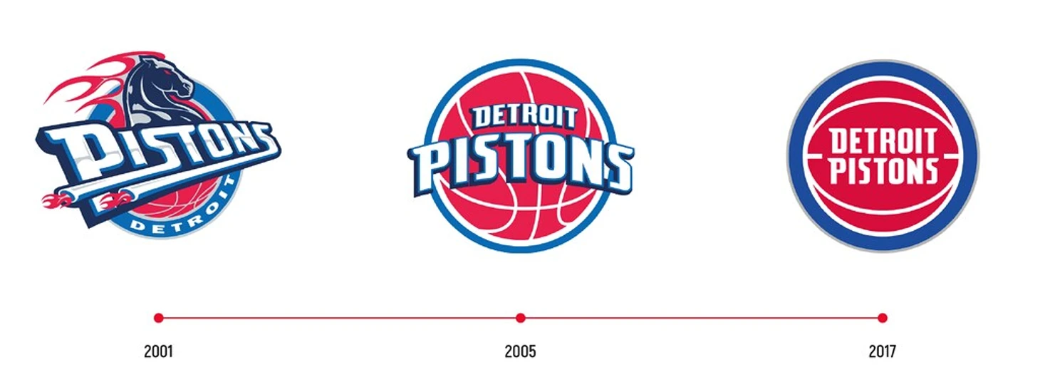 Эволюция логотипа Детройт Пистонс — наглядный пример нескольких эпох в спортивном дизайне.