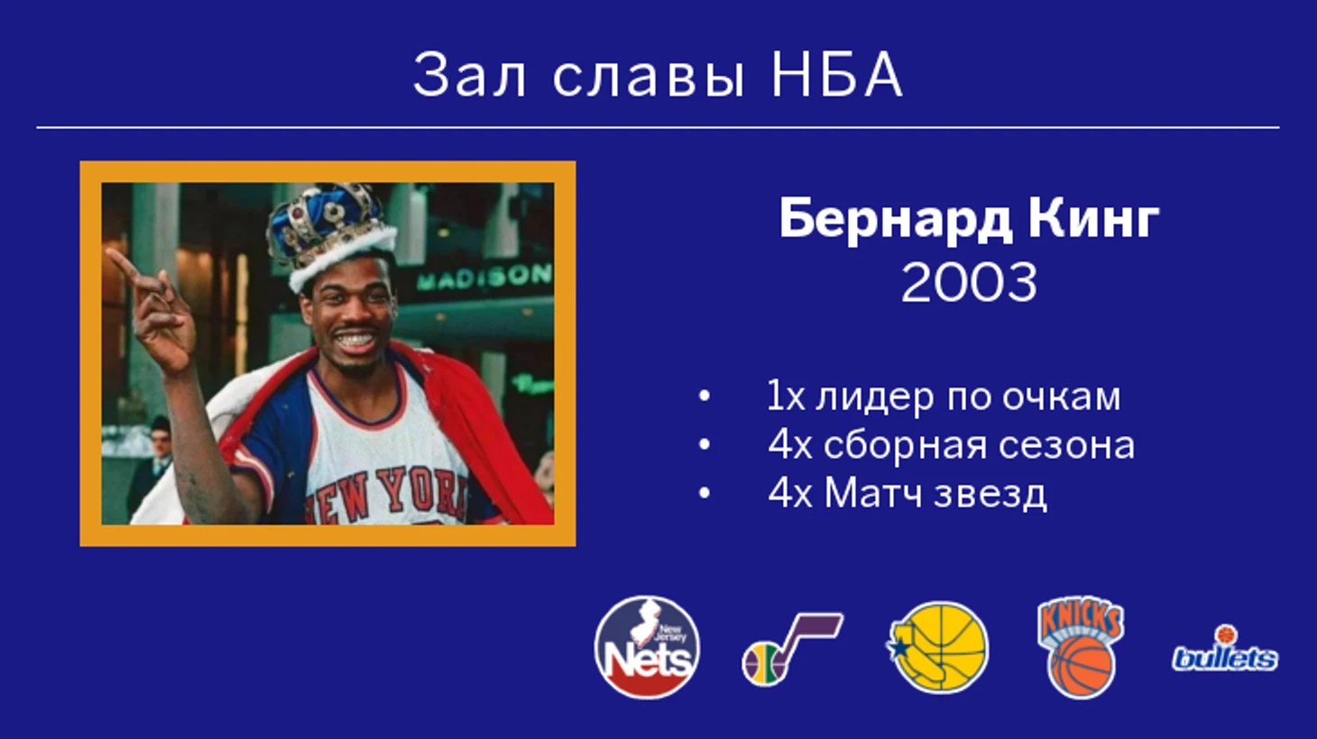 | Бернард Кинг | 1994 | 6 | 9 | 9 | 10 | 10 | 10 | 11 | 11 | 11 | 12 |